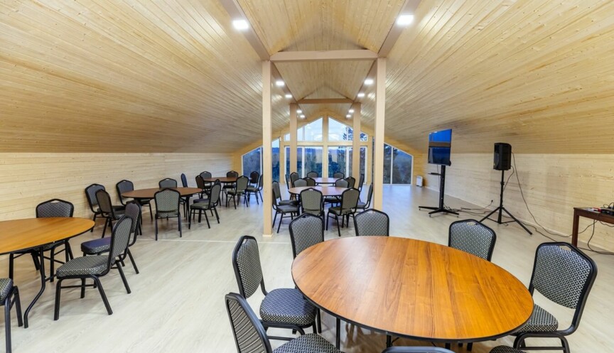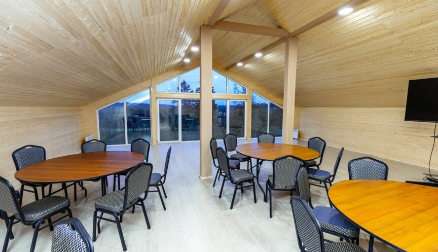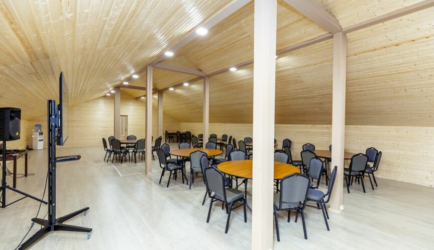 Восхитительный вид на Москва-реку и лес из панорамного окна, занимающего всю стену. Идеально подходит для проведения деловых мероприятий и ретритов.
