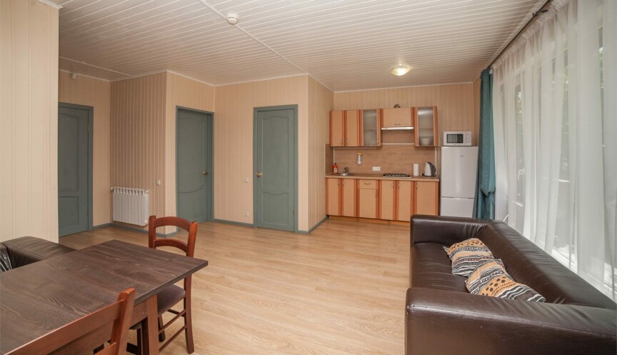 В каждом коттедже есть кухонная зона для приготовления пищи с газовой плитой, финская сауна, мангальные зоны для барбекю, телевизор, холодильник.